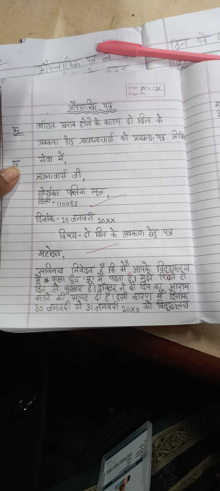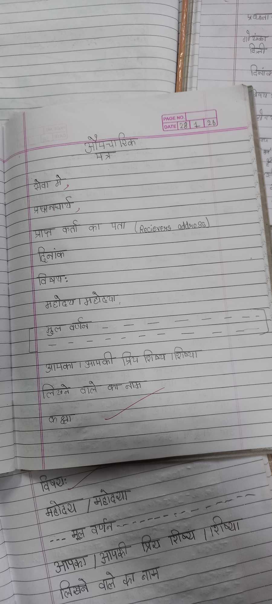 Kindly complete the format of formal letter (औपचारिक पत्र) in your hindi notebook and today's patra done in the class.
