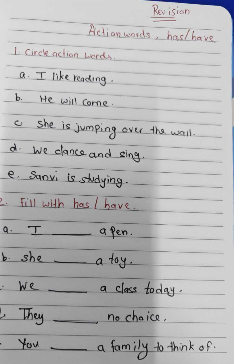 Revise classwork and do practice of action words and has /have for test tomorrow